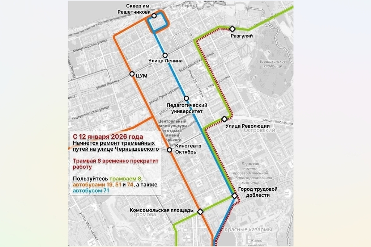 Напомним, с 12 января на улице Чернышевского в Перми стартовала реконструкция трамвайных путей. Здесь также построят новую остановку.